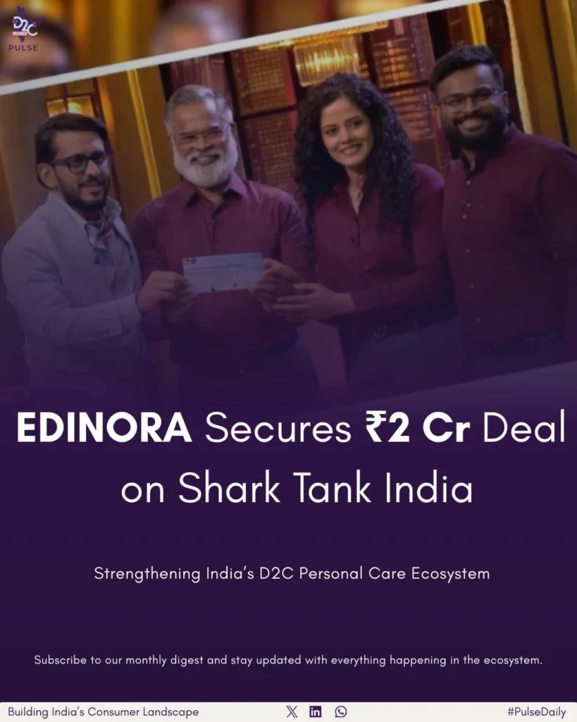 The Kerala-based EDINORA made headlines on Shark Tank India Season 5 when it secured a ₹2 Crore investment from investor Aman Gupta, co-founder of boAt, in exchange for equity. This deal was not just a milestone for EDINORA but also a signal to the entire D2C personal care ecosystem that early-stage brands with strong traction, digital presence, and repeat customer engagement are increasingly attracting serious funding. (pulse.d2cinsider.com)